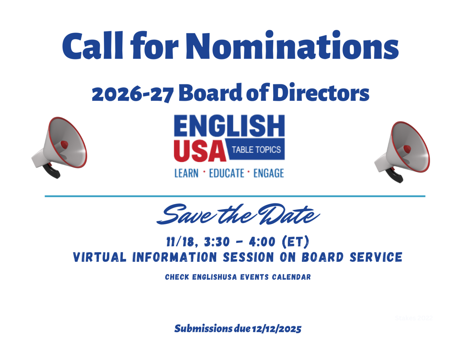 Come learn more about board service on EnglishUSA. Submissions (self-nominations) are due on December 12th. Current and past board members will be available to share their experiences. Check out the call here.