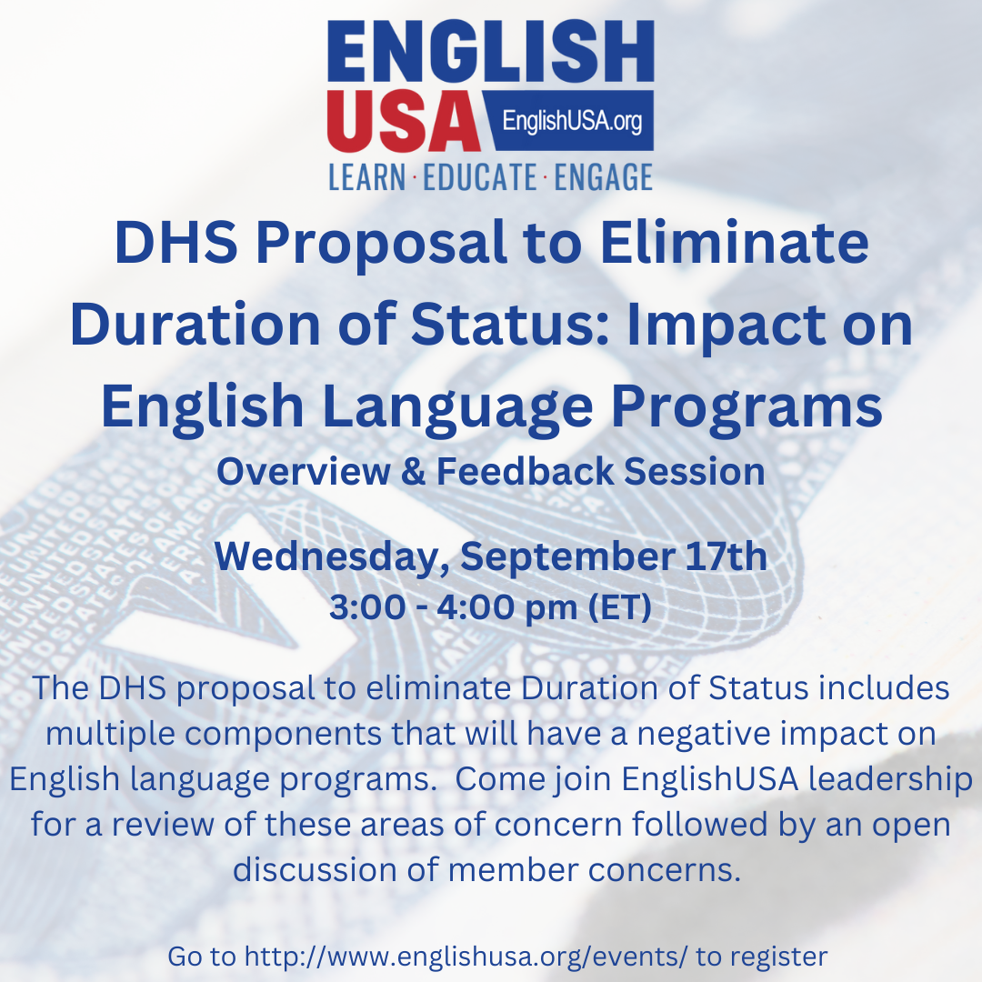 The DHS proposal to eliminate Duration of Status includes multiple components that will have a negative impact on English language programs. Come join EnglishUSA leadership for a review of these areas of concern followed by an open discussion of member concerns.