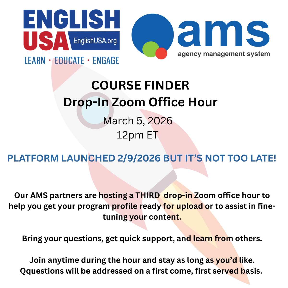 EnglishUSA launched the Course Finder platform on February 9th. It's not too late to get your profile up and running. EnglishUSA and our AMS partners are hosting an additional drop-in Zoom office hour to help you fine-tune your program profile. Don't miss out on this great opportunity to reach more students and agents.
