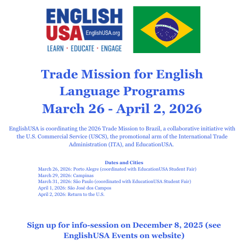EnglishUSA is coordinating the 2026 Trade Mission to Brazil, a collaborative initiative with the U.S. Commercial Service (USCS), the promotional arm of the International Trade Administration (ITA), and EducationUSA.