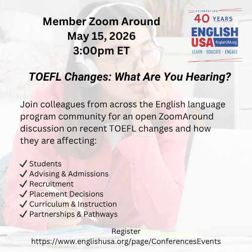 Join colleagues from across the English language program community for an open ZoomAround discussion on the recent changes to the TOEFL and how they are affecting students, advising, recruitment, curriculum, and classroom instruction.